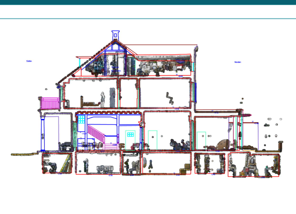 Für das Scannen des 150 Jahre alten Gebäudes nahm mit etwa 350 Standpunkten und einer Wohnnutzfläche von 1.000 m² benötigte das Team drei Tage. Die anschließende Registrierung und Bereinigung der Punktwolken, sowie das Auswerten und Ableiten von Geometrien daraus nahm noch einmal das 3,5 fache dieser Zeit im Innendienst in Anspruch.