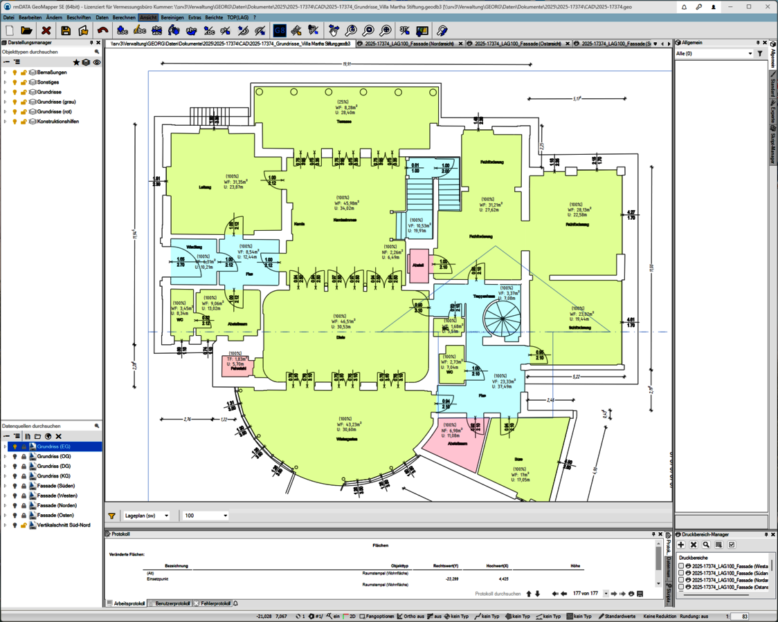 Der Vermessungsingenieur ergänzt jedoch, man werde von Projekt zu Projekt schneller und effizienter: „Die Lernkurve in 3DWorx ist jedenfalls sehr steil und es war spannend, sämtliche Möglichkeiten in der Software für die denkmalgeschützte Villa auszuloten.“ Wichtig ist Kai Grünhagen der reibungslose Workflow zwischen den Software-Produkten. Nur so können in 3DWorx Geometrien in kürzester Zeit abgeleitet, als DWG-Dateien exportiert und in rmDATA GeoMapper ausgestaltet und bemaßt werden.