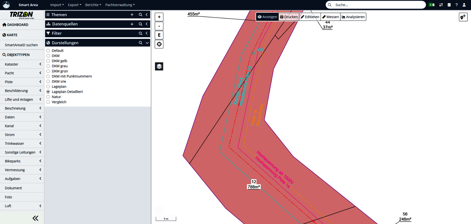 Mit der neuen Darstellung „Lageplan Detailliert“ erhalten Sie eine maßstabsabhängige, detaillierte Skalierung und Beschriftung Ihrer Objekte. Diese präzise Visualisierung stellt alle wichtigen Informationen klar und übersichtlich dar und eignet sich ideal für den Export, sodass Sie Ihre Daten nahtlos und in hoher Qualität weiterverarbeiten können.