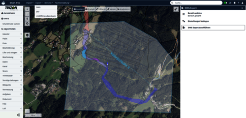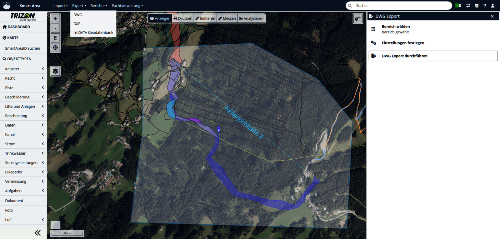 Egal, ob DWG, DXF oder rmDATA Geodatenbank, exportieren Sie Ihre Daten im gewünschten Format und nutzen Sie diese flexibel in rmDATA- oder Drittanbieter-Anwendungen. Der Export erfolgt direkt und bequem über die Karte, wobei Sie den gewünschten Bereich flexibel selbst festlegen können.